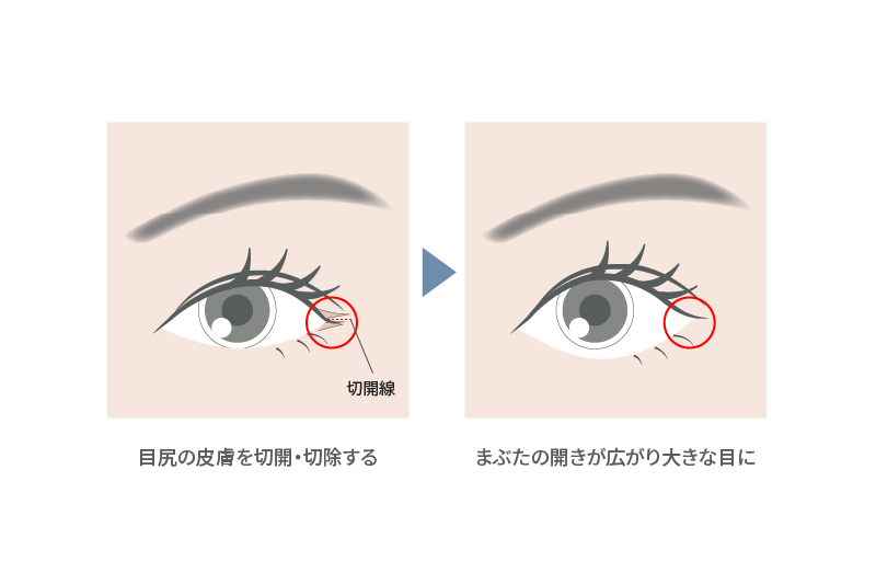 特に、目尻の皮膚や筋肉によって白目が隠れている方は、切開によって目の開きが広がり、印象が大きく変わります。ただし、もともと目尻の構造上、改善幅に個人差があるため、診察にてご自身の状態を確認することをおすすめします。